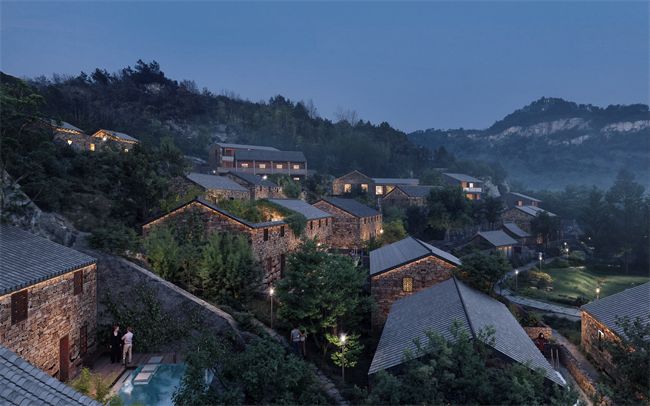 酒店以“保护性利用”为核心原则:对存量建筑采用“金缮修复”手法,保留原有记忆与立面特征,局部更新功能、重塑构件,实现“尊重历史”与“创造新貌”的平衡;对海岛洞窟群则以“留、嵌、补”策略打造场地亮点,将洞窟与古村聚落结合,构建“古与今对话”的穿越式沉浸场景。同时,酒店延续line+“城市高端营造与乡村地域实践双线并行”的思路,在挖掘蛇蟠岛“忽闻海上有仙山,山在虚无缥缈间”的山海文化同时,兼顾商业价值,为住客提供“自然野趣 +探寻历史”的海岛度假新体验,打造“海岛洞窟度假”的标杆产品。